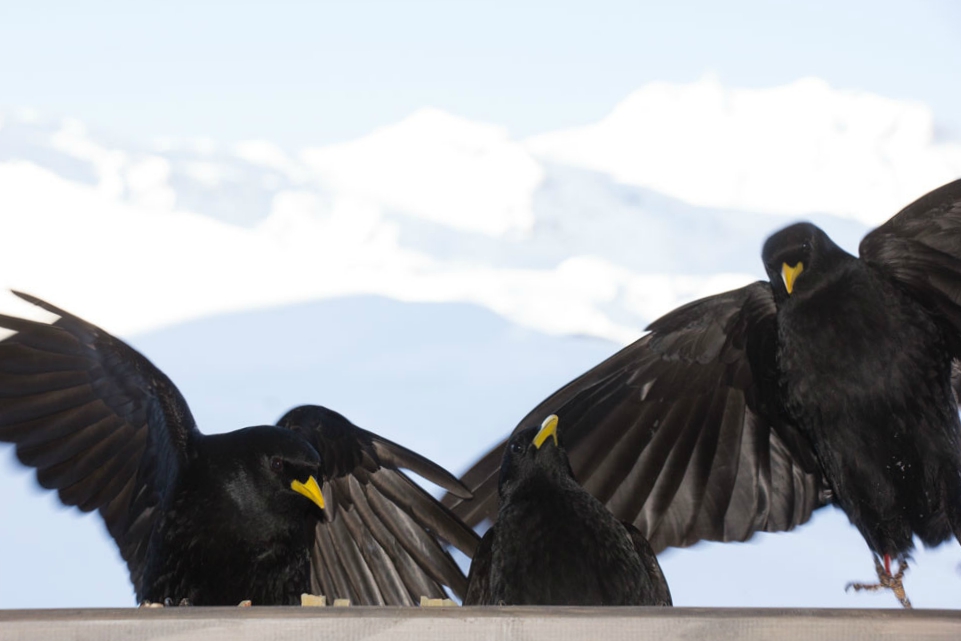 A 'chocard' is the most common type of crow seen in Val Thorens. It has red legs and a yellow beak, and is also known locally as a 'choucas'; the name in English is Alpine chough.
