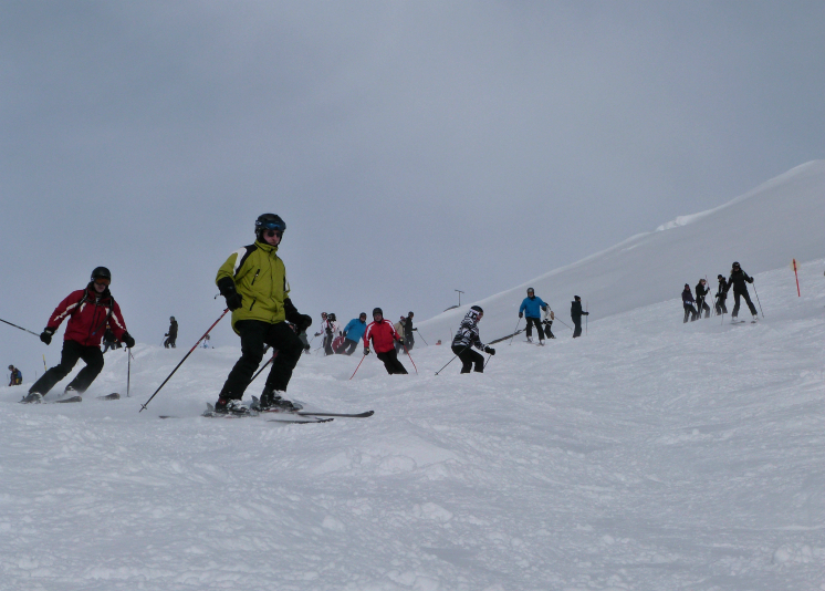 Plein Sud means south facing (literally, fully south). The Plein Sud piste, accessed by the Plein Sud and the Pionniers chairs, is wide, and has snow cannons all the way down. This means that it usually has good snow cover.